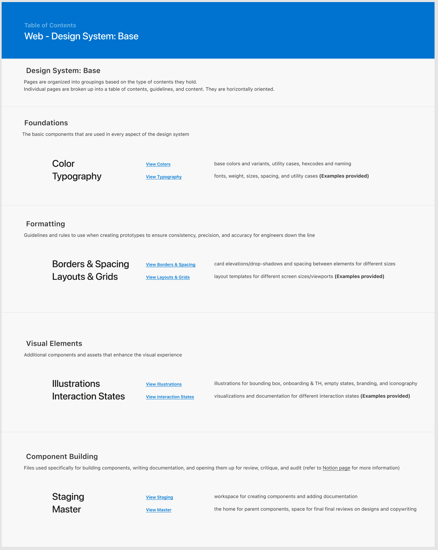 - I built a table of contents landing page where designers were able to see an overview of the exact contents of each page. This table of contents contained the page title, description, and clickable link for easy navigation. I added two ways to view this table of contents: 1 on the design system file in Figma, and one in our design team’s Notion page, both of which you can see here.