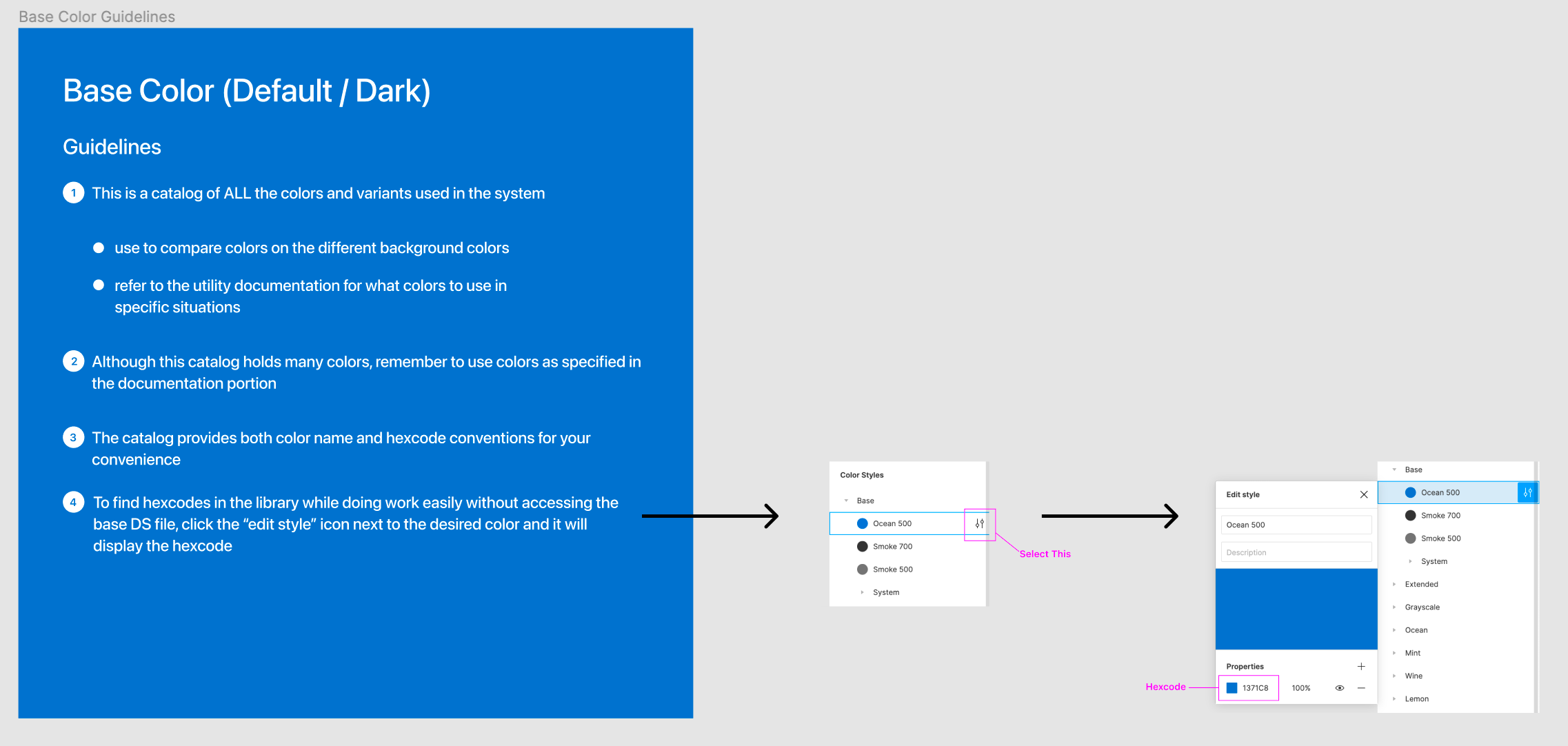 Documentation: In general there was a lack of documentation and commenting in the design system, making it difficult to know what exactly a designer is looking at. To fix this, I added a guidelines caption to every frame that summarizes the exact contents.