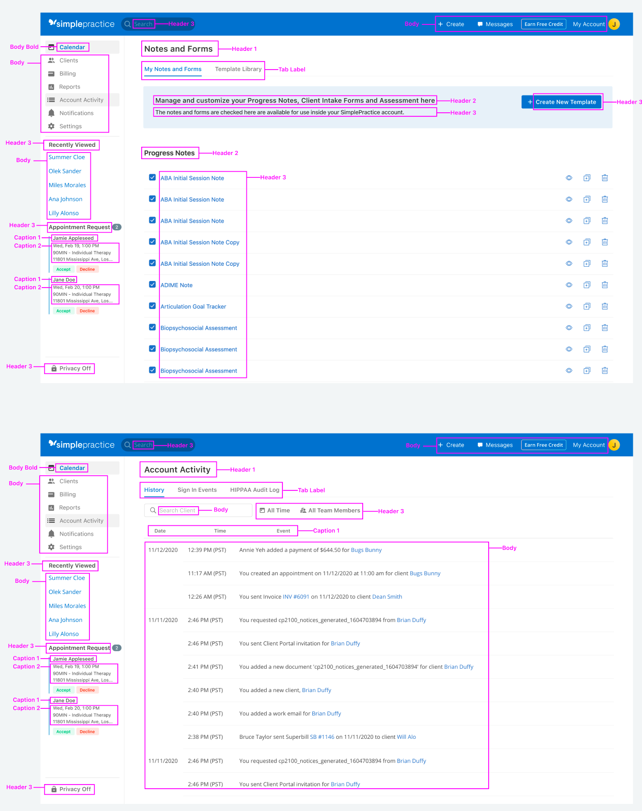 Context: To add to documentation, I also added screenshots and examples pulled from SimplePractice products to show how the components should be used when designing and how they appear in reality when launched.